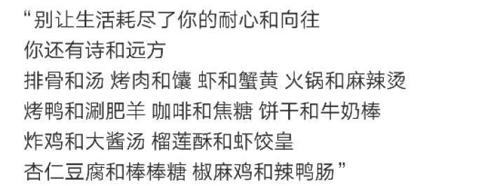 别让生活耗尽了你的耐心和向往 你还有诗和远方 排骨和汤 烤肉和馕 虾和蟹黄 火锅和麻辣烫 烤鸭和涮肥羊 咖啡和焦糖 饼干和牛奶棒 炸鸡和大酱汤 榴莲酥和虾饺皇 杏仁豆腐和棒棒糖 椒麻鸡和辣鸭肠