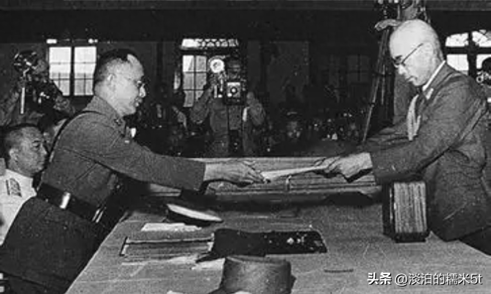 1945年9月9日,何应钦在南京代表中国政府接受侵华日军总参谋长小林浅三郎递交的侵华日军总司令冈村宁次签署的投降书。