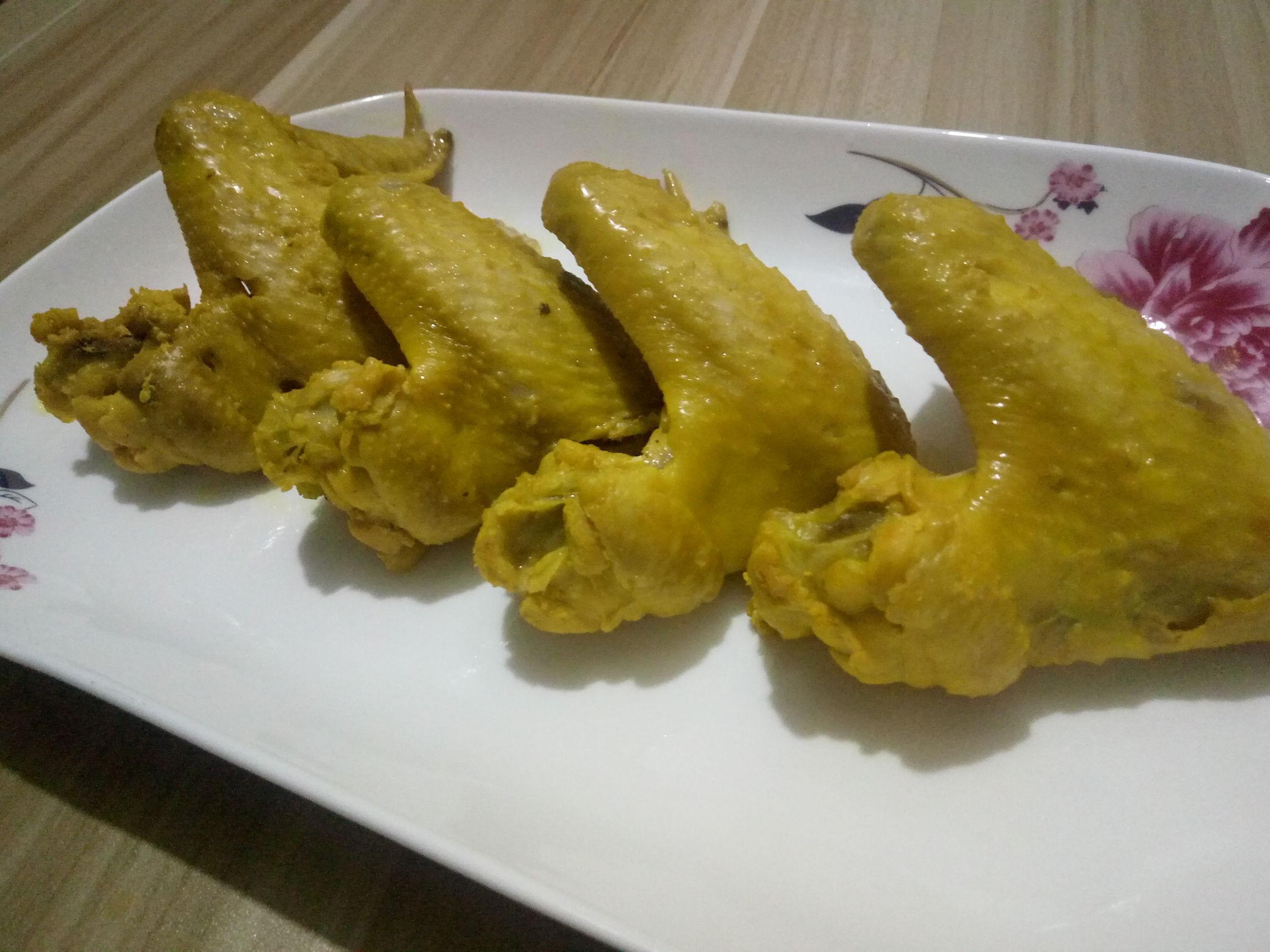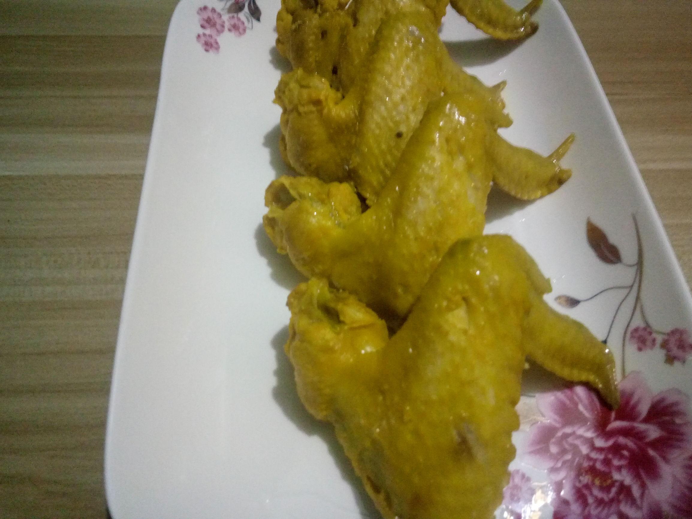 材料:鸡翅4个,盐焗鸡粉一包,黄桅子4个,姜片,料酒适量