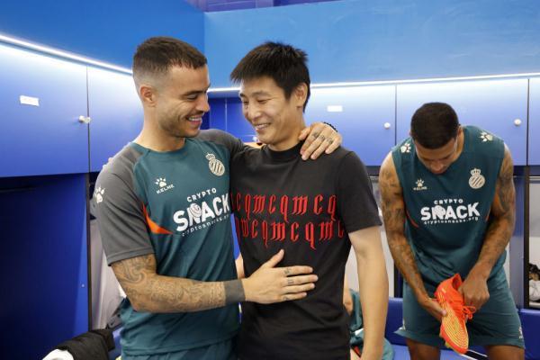 ↑8月11日,武磊(前右)在西班牙人主场与球员劳尔·德托马斯告别。