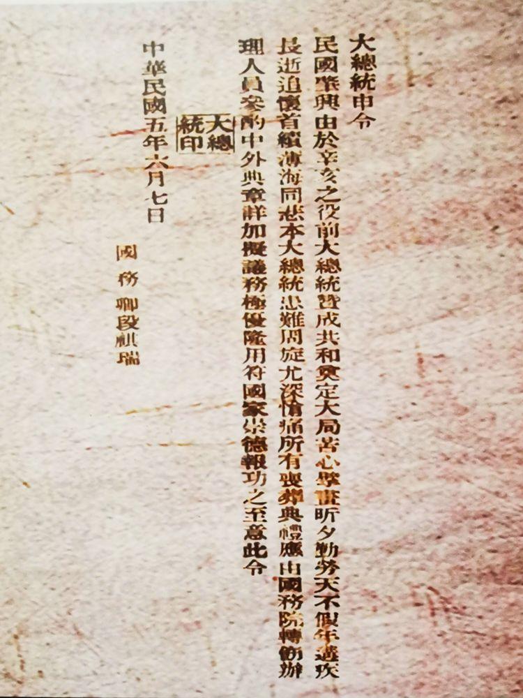 袁世凯病逝于北京,继任大总统黎元洪颁布命令,为袁世凯举行国葬。