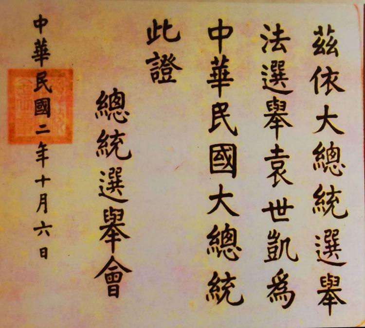 中华民国大总统证书。经国会选举,1913年10月10日,袁世凯就任中华民国第一任正式大总统。
