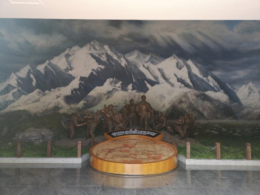 纪念馆门厅是红军在雪山、草地中的场景,正中央是红军长征路线图。