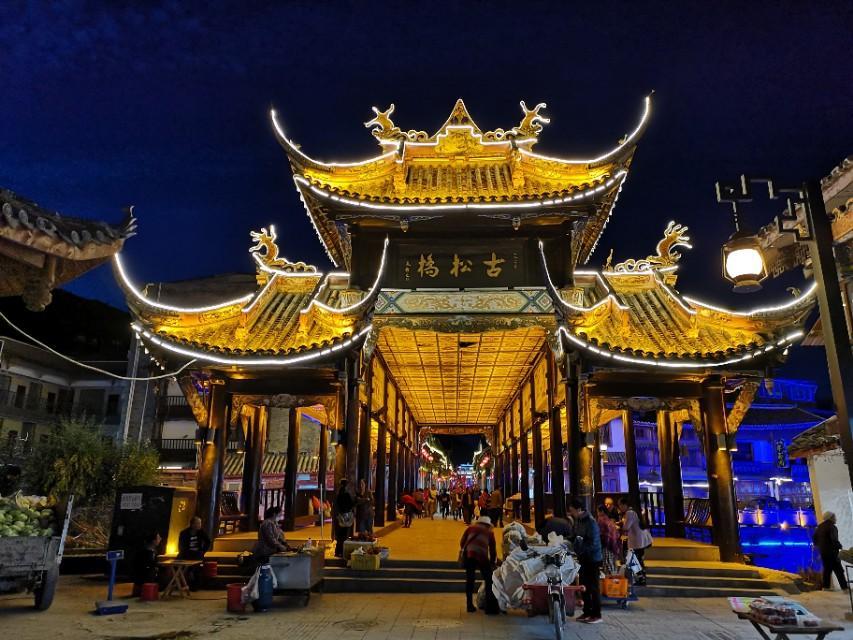 古松桥上,白天的集贸市场,热闹的人流早已经退潮,只剩下三三两两的摊位,在昏暗的灯光中坚持着。
