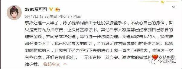 “这段时间我体会到了生无可恋的疼,感受到舆论的锋利,以及在利益面前,人心的贪得无厌。”不管这句话是针对谁,车祸之后,她在承受着以往所不敢想象的压力。