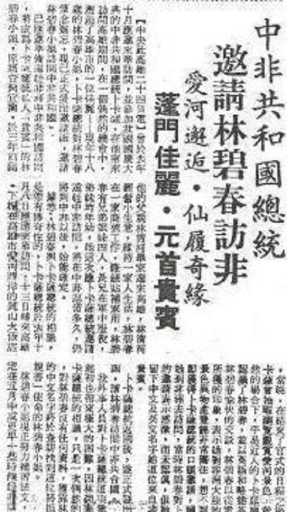 于是,博卡萨上前搭讪,跟林碧春攀谈起来,林碧春也没有怯场,用简单的几句英语、法语勉强交谈了一会儿。