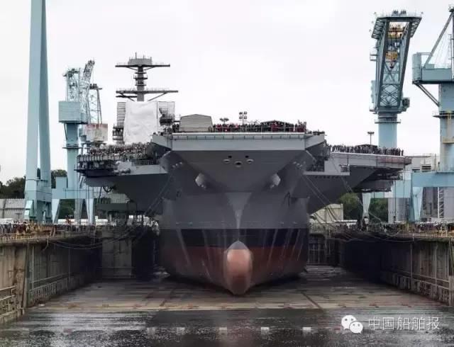 2013年11月9日,美国新一代超级航母的首舰CVN-78“杰拉尔德·R·福特”号(简称“福特”号)完成舰体建造,在弗吉尼亚州纽波特纽斯造船厂举行下水仪式。成功下水的“福特”号航母在完成后续舾装工作后,按原定计划于2015年服役,但直到今年4月,它仍在接受最后阶段的调试。