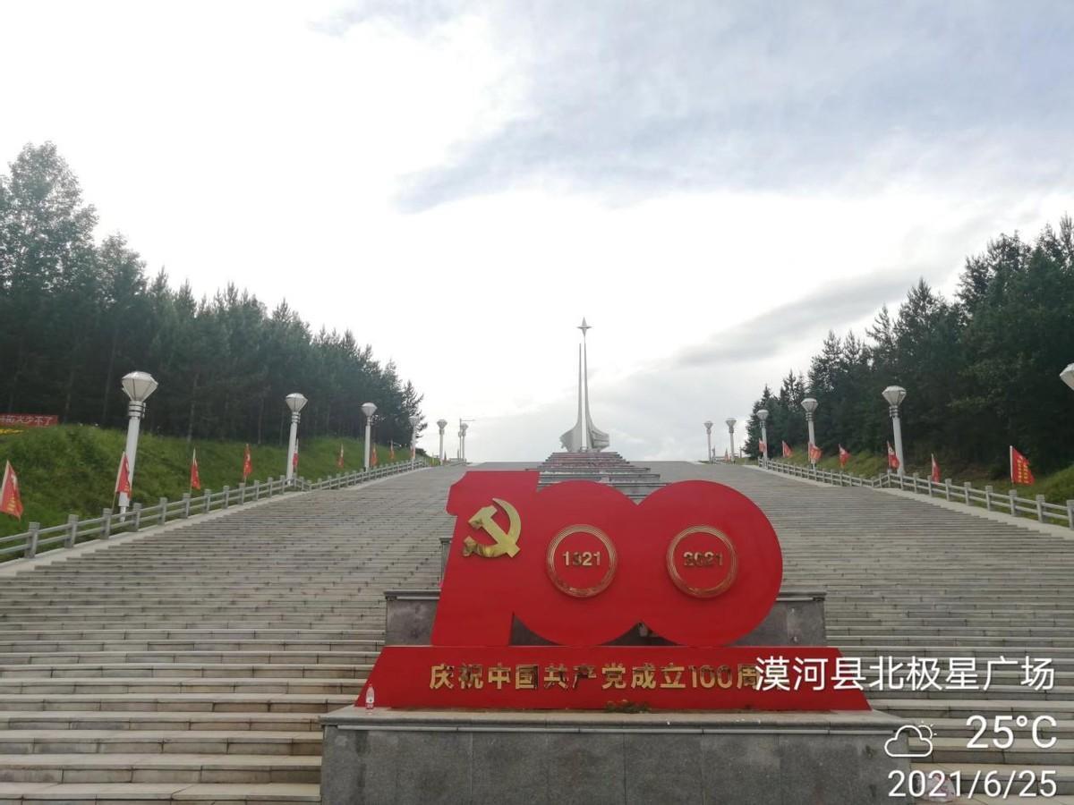 去北极村路过漠河,知道这里有一个北极星广场,将车直接开到了广场山下。北极星广场建在漠河城市南面的一个高坡之上,从山脚下到高坡上有很高大宽阔的石阶,远远望去,很气派。北极星广场是一个很不错的游览和休闲的场地。