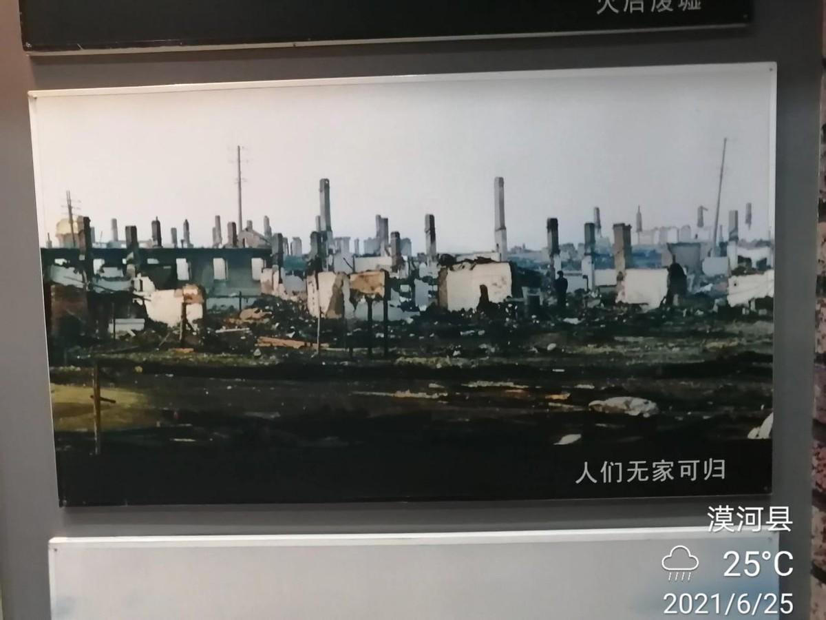 纪念馆里有很多当时现场拍照的图片,还有很多还原了的当时火场的情景,其状惨不忍睹。大火过后,山岭上那满眼的绿色不见了,取而代之的是大片的焦土和“黑色森林”。残墙、断壁、废墟、焦土,一根根黝黑的烟仿佛一座座墓碑,一块块惨白的布块包裹着烧焦的尸骸。一夜之间家破人亡、妻离子散,这场因为巡林员烟头未灭引发的特大火灾,转瞬之间林毁城亡、百业皆废。漠河人民遭受到的打击不亚于汶川地震。