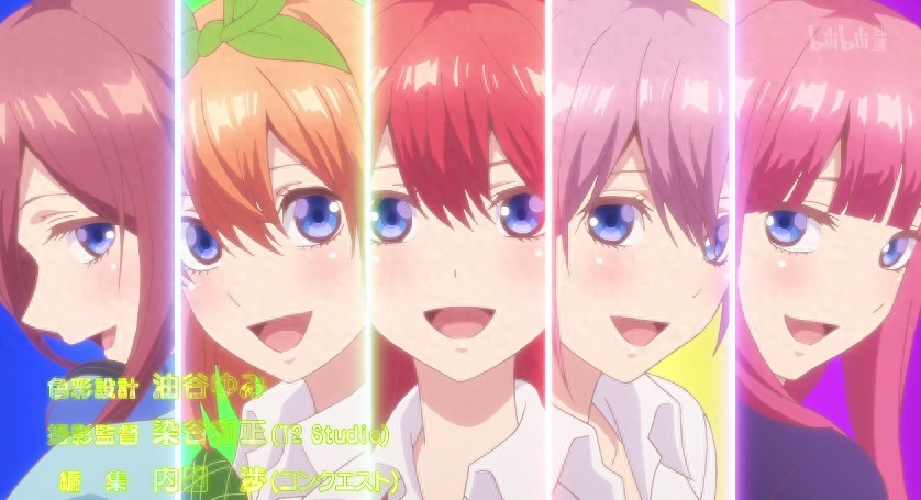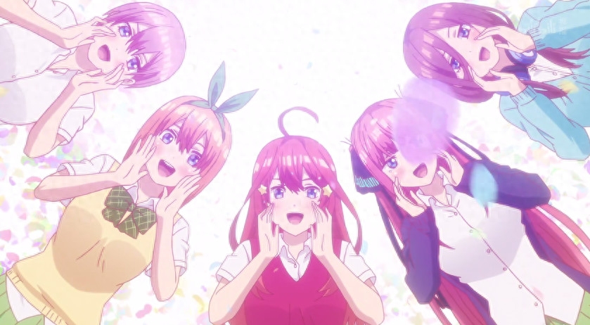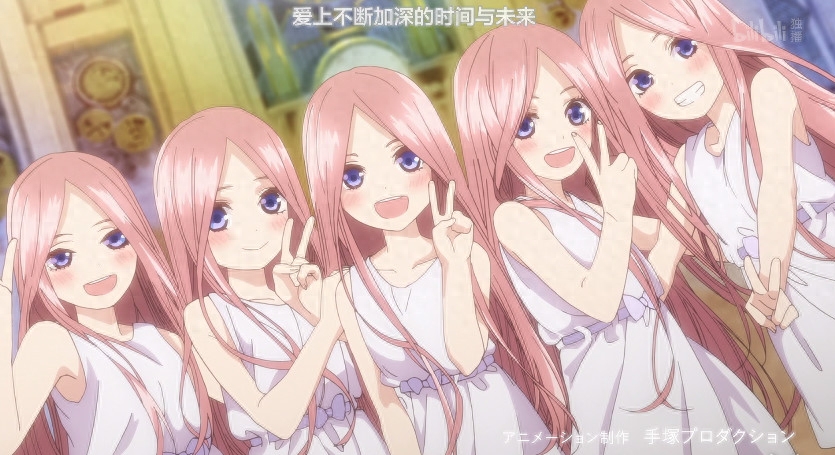 关于这一点,其实不用解释很多,动画的OP开头曲中,五姐妹同屏出现时五月总会出现在最中间的位置,也就是我们常说的C位,因为动漫里面的女主角作为核心人物,必须“闪亮登场”啊,否则你让主角在一个不起眼的位置出现,有谁会记得住呢?所以按照恋爱动漫的规律,位于中间C位的肯定是最受作者喜欢的人物,无疑就是最后的新娘啦。