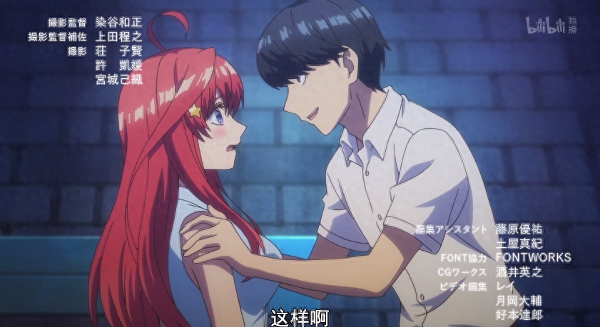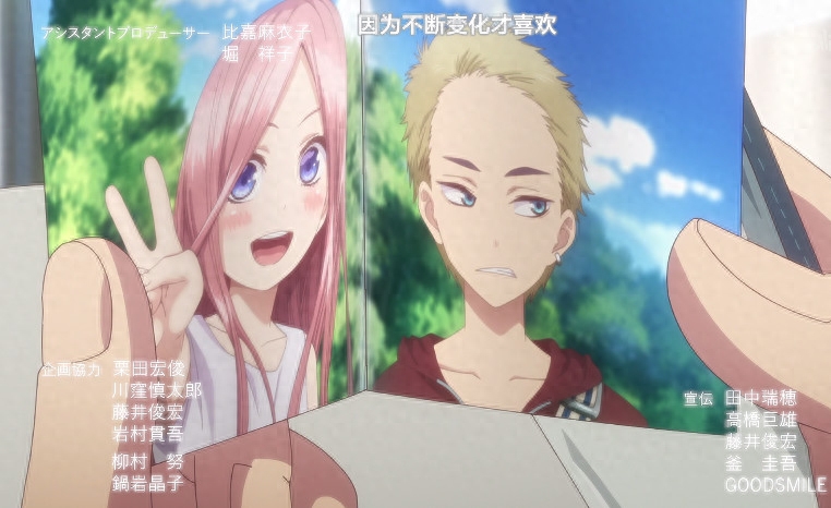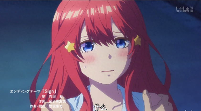 纵观目前动画的所有片尾曲部分,除了第五话中烟火大会五姐妹团聚和第七话中期末考试最后五姐妹全员伪及格的剧情外,就只有第一话中五月存活到了动画ED阶段,其他话的片尾曲都是一模一样的,这个说明了五月在官方看来也是很特别的存在,为了五月特别制作了这个ED,当然也有可能是官方当时经费不足来不及制作完整的通用版本的ED?但是就算经费不足,“钱花在刀刃上”想必是制作方的常规做法,这种待遇无疑是对五月是真女主的最好证明了......