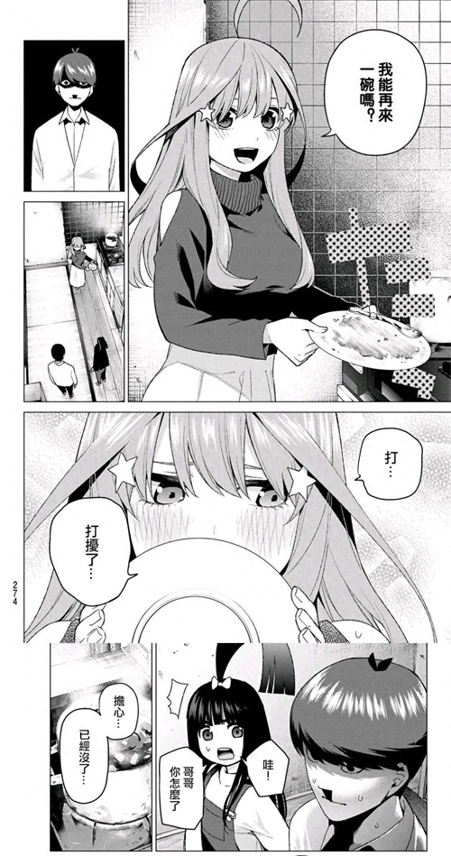 通过分析目前连载的漫画,针对人物的特写、台词、登场进行了庞大的数据分析,得到角色内容占比:一话16%,二乃23%,三玖22%,四叶12%,五月27%,说明作者潜意思中非常喜欢这个角色,这点看来,五月从一开始就已经是赢家了啊~~