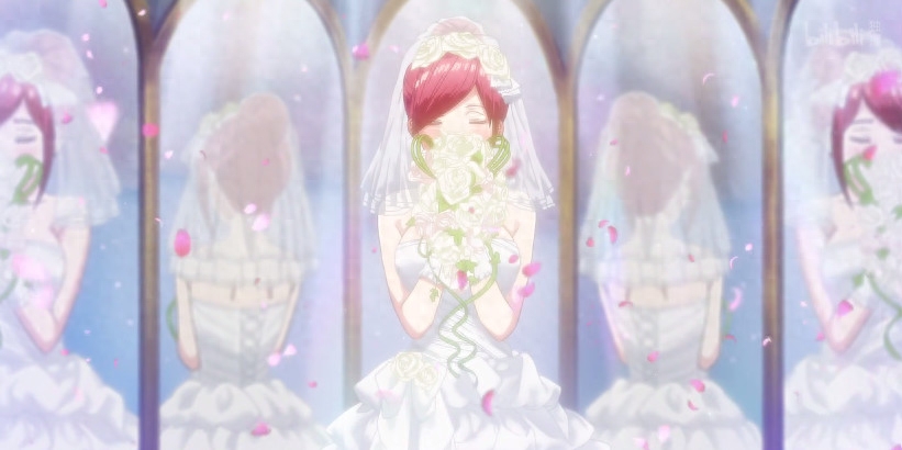 对比上面两个图,我们可以发现,从新娘的头发颜色来看,颜色最接近的,只可能是五月,三玖和二乃,但是三玖的发色稍微比较暗一点,五月和二乃的可能性最大了......由于五月还是处于C位展示,所以新娘很大概率是五月!但是有的观众可能会说,发色也可以染发啊,但是小编觉得结婚时候头发染个发也太奇怪奇怪了吧,而且如果染成前女友的发色,你认为新娘会接受这种要求吗?