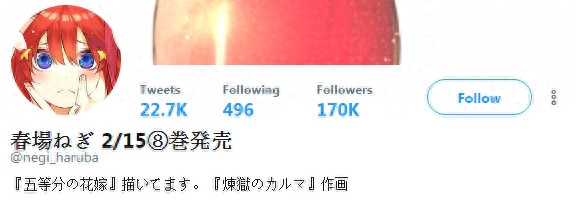 小编哈酱关注了《五等分的花嫁》的作者春場ねぎ的的社交账号,其中他的推特(Twitter)头像是五月,而且推特的内容中五姐妹都顾及到了,但是其中出现最多的名字就是五月,这就说明作者很喜欢这个人物,换句话说作者希望自己的新娘能够像五月一样优秀,有时候光看头像就可以了解到作者的内心世界了,毕竟头像对于作家来说也是一种精神信仰呐!