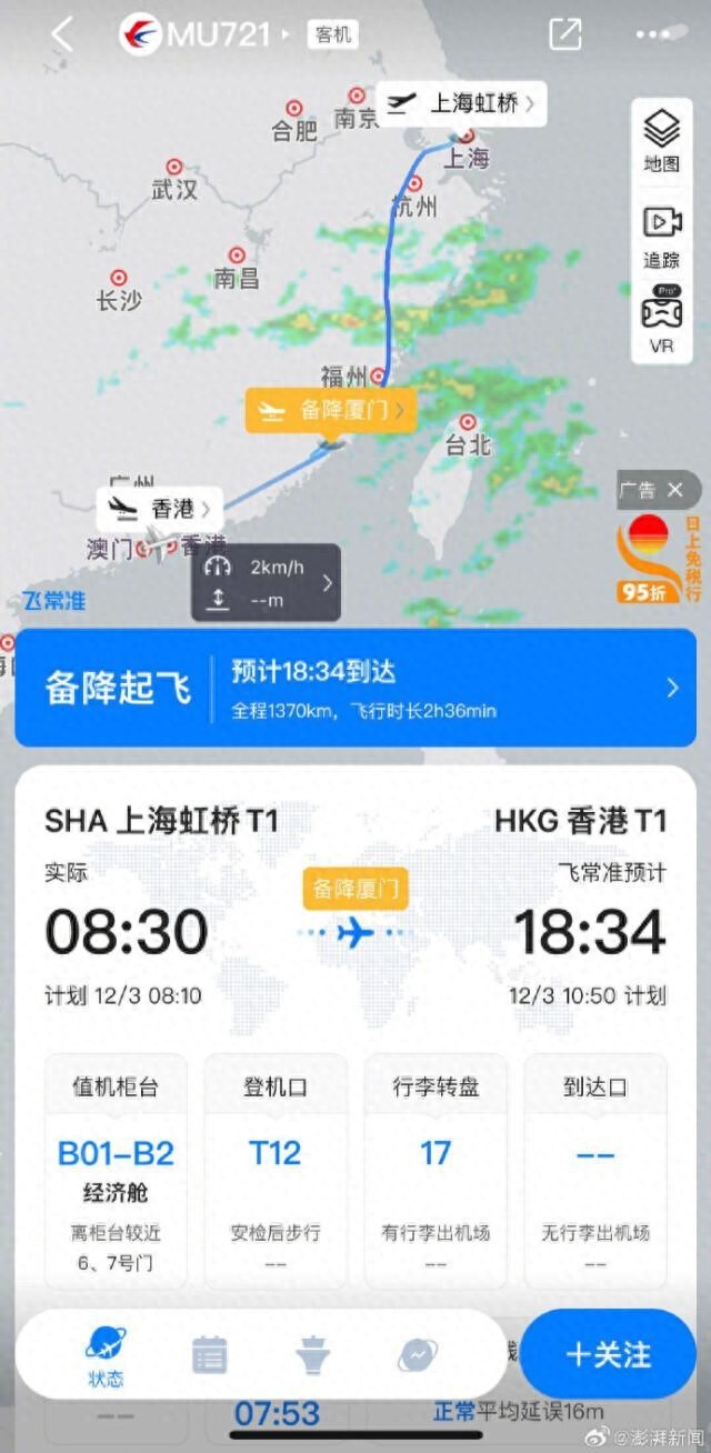东方航空一架从上海虹桥飞往香港的航班在飞行途中突发故障,不得不紧急备降厦门,旅客们惊慌失措。