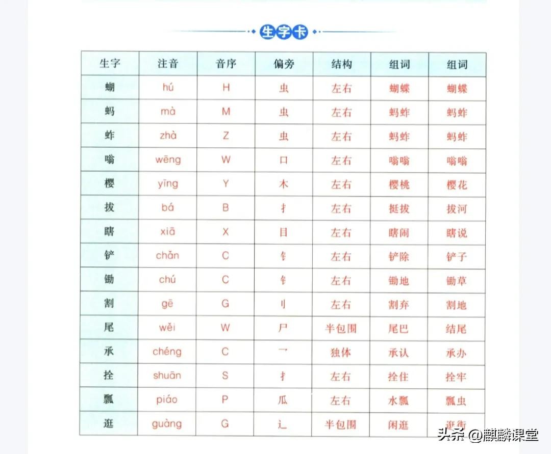 生字方面,“蝴”“蝶”是左右结构,注意虫字旁的写法;“蚱”字笔画较多,右边“乍”的笔顺要记清;“倭”字不要读错,是“wō”音。