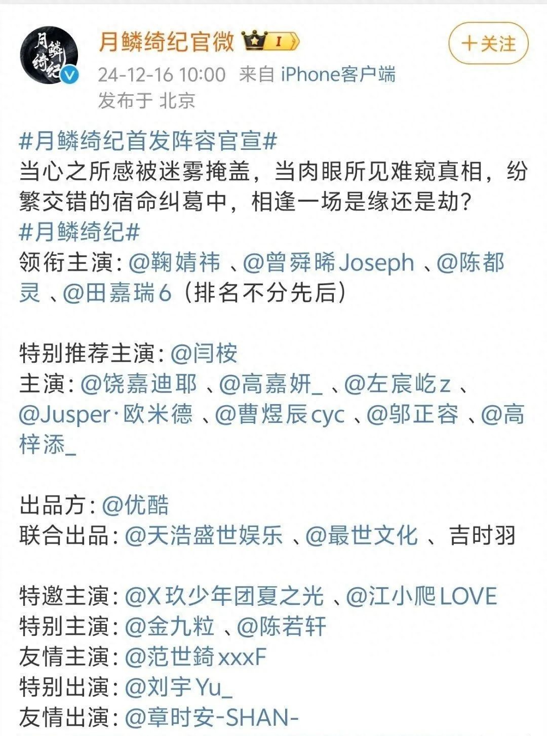 12月16日当天,各大主演纷纷在社交平台转发了《月鳞绮纪》的概念海报,引发了大量关注。与此同时,官方抖音也同步发布了概念海报的动态版本,配上了背景音乐,进一步提升了观众的期待值。