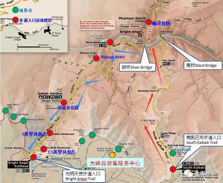 由于向下走是一路下坡,会比较快,但要往回走就痛苦了。另外考虑到避免走回头路,回程建议选择另一条路线光明天使之路(Bright Angel Trail,蓝箭头),虽然长一点,但是更平缓好爬,而且能少爬大约110米海拔。这样走全程大概27公里,对于一整天是很大的量,一日走下来会比较艰苦。