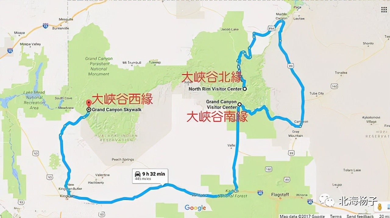 南凯巴布步道(South Kaibab Trail)是大峡谷的另一著名的步道。从步道起点到峡谷最底下的科罗拉多河,是大峡谷景观最具代表性的徒步路线,壮丽无比,单程下降大约1460米,长度大约11公里(红箭头),步道非常陡峭。