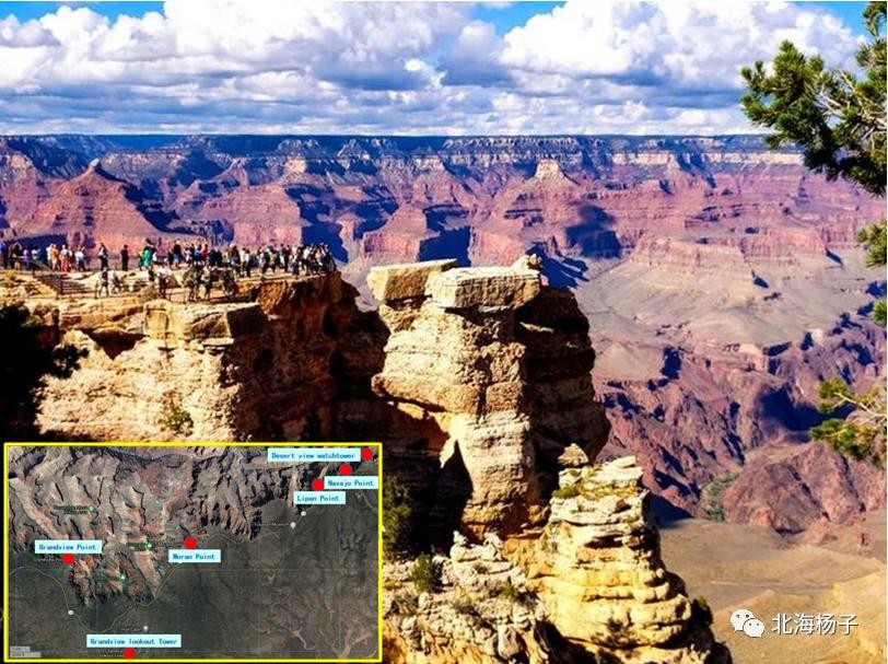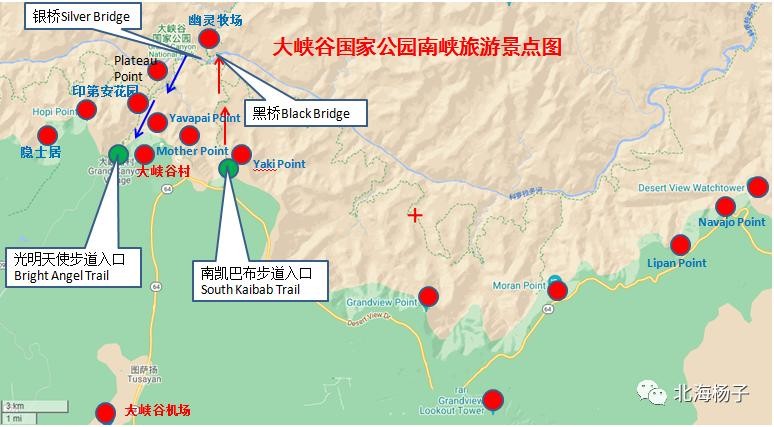 南峡景点(由西往东)主要有:1.Mermit's Rest、2.hopi Point 、3.Yavapai Point、4.Mather Point 、5.Yaki Point、6.Grandview Point 、7.Moran Point 8.Lipan Point 9.Navajo Point 10.Desert View Watchtower。