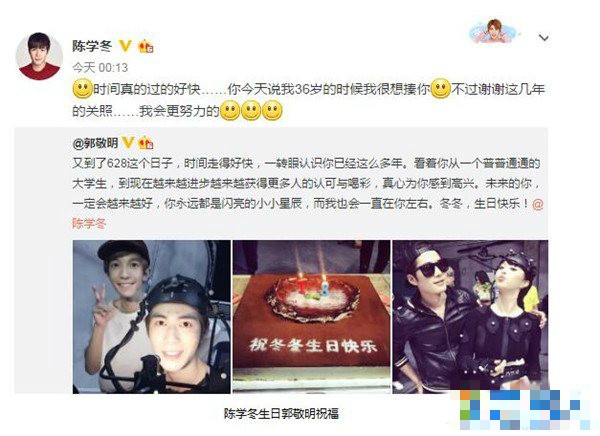 借由人气电影《小时代》小鲜肉陈学冬迅速走入人们的视线中,而陈学冬和郭敬明的感情相信大家也有耳闻,近日他们又“舔屏”了6月28日是陈学冬生日,好友郭敬明[微博]第一时间更新微博为他庆生,还晒出了两人的合影和生日蛋糕,郭敬明称:“又到了628这个日子,时间走得好快,一转眼认识你已经这么多年。看着你从一个普普通通的大学生,到现在越来越进步越来越获得更多人的认可与喝彩,真心为你感到高兴。未来的你,一定会越来越好,你永远都是闪亮的小小星辰,而我也会一直在你左右。