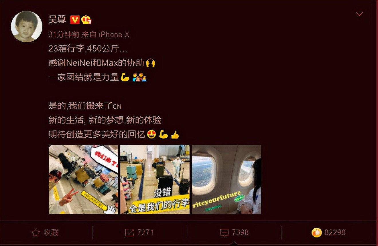 3月21日,知名艺人吴尊在微博发文称,全家四口搬来中国定居的消息,大大小小23箱行李,总共450公斤,在家人的帮助下,已经安全抵达中国,直言“我们来了CN,新的生活,新的梦想,新的体验”。