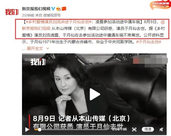 随后,据新京报报道,采访到《乡村爱情》演员刘流,他透露称,于月仙是在去参加活动的途中遭遇车祸不幸去世。