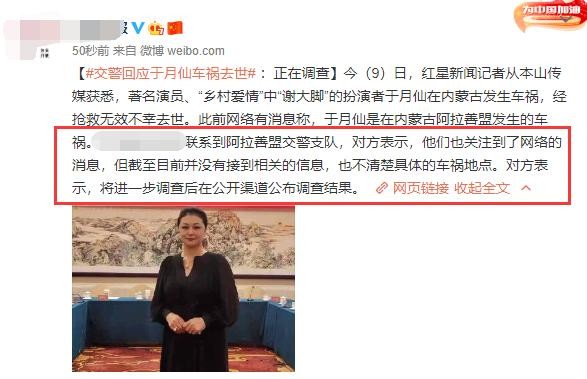 于月仙去世的消息曝光后,有媒体联系到了阿拉善盟交警支队询问车祸的具体情况,交警表示,目前没有接到相关信息,也不清楚具体的车祸地点,需要进一步调查,才会知道结果。