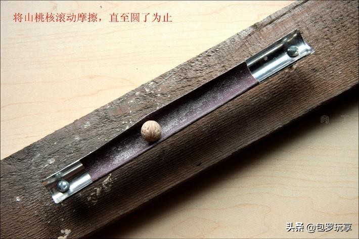 清理完成之后桃核已经变得非常漂亮了,但是并不完美。如果仔细看的话会发现,山桃核的边缘有一个“唇”或者有的不是很圆,接下来我们就需要将在砂纸上进行优化。我这里使用的是自制的磨具进行打磨的,感觉还不错。
