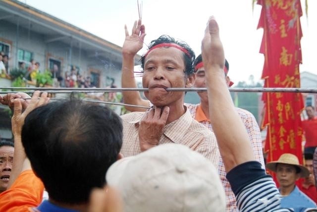 其中最为激动人心的就是“穿杖”,光听名字大家可能不清楚是什么,其实“穿杖”就是将长长的钢钎从面颊处直接穿透并穿透另一边的面颊(这个有的只穿一边面颊,有的穿两边面颊),当然穿仗人都不是普通的人,据说这些都是被“神灵上身”的“僮身”,穿杖前会有一场祭祀仪式,通常都是头上绑红绳,手中拿红香,嘴里念念有词的癫狂起舞,当公租上身后便拿起钢钎慢慢的插入面颊而后游走在街道上,看见的人会将钞票插在钢钎上。