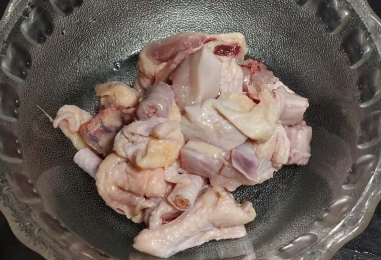 2、将上面清洗干净的鸡剁成小块,注意鸡肉中皮下油脂过多的部分切除,一般在屁股附近的部分皮脂都是非常多的,这部分都可以直接切除掉。在加入清水浸泡5分钟左右,再用清水清洗2~3次左右。捞出滤水后放一旁备用。