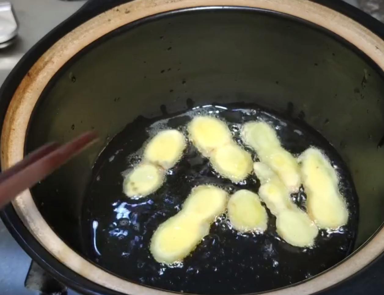 5、热锅,放入一点点的食用油,将姜片放入炒香即可。