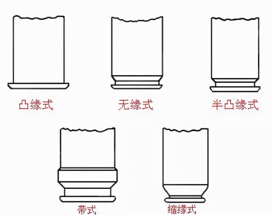 弹壳也可以依照尾端底板的形状分为缩缘式、无缘式、半凸缘式、凸缘式以及带式这五种。所谓凸缘、无缘或者缩缘指的是弹壳底板的直径跟弹壳直径之间的关系,以缩缘式底板来说就是底板边缘直径明显小于弹壳主体直径的意思;无缘式底板指的是底板边缘直径和弹壳主体直径相近;半凸缘式底板边缘直径明显大于弹壳主体直径,不过仍有退壳沟;凸缘式底板边缘直径极明显地大于弹壳主体直径,而且没有退壳沟设计;带式除了类似无缘式底板的底部外,在退壳沟前方的弹壳上另有一带状环。