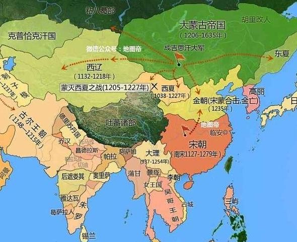 宋朝时期,在蒙古高原上的突厥系民族的统治逐渐衰落,东边的室韦诸部开始西迁至蒙古高原内部。12世纪时,这部分人子孙繁衍,氏族支出,逐渐分布于三河流域和外蒙古肯特山以东一带,组成部落集团。其中较著名的有乞颜部、札答兰部、泰赤乌部、弘吉剌部等民族和部落。公元1206年,蒙古乞颜部黄金家族杰出的领导人铁木真统一蒙古草原,东征西讨,震惊世界,蒙古人一时间成为亚欧大陆上的新主人。