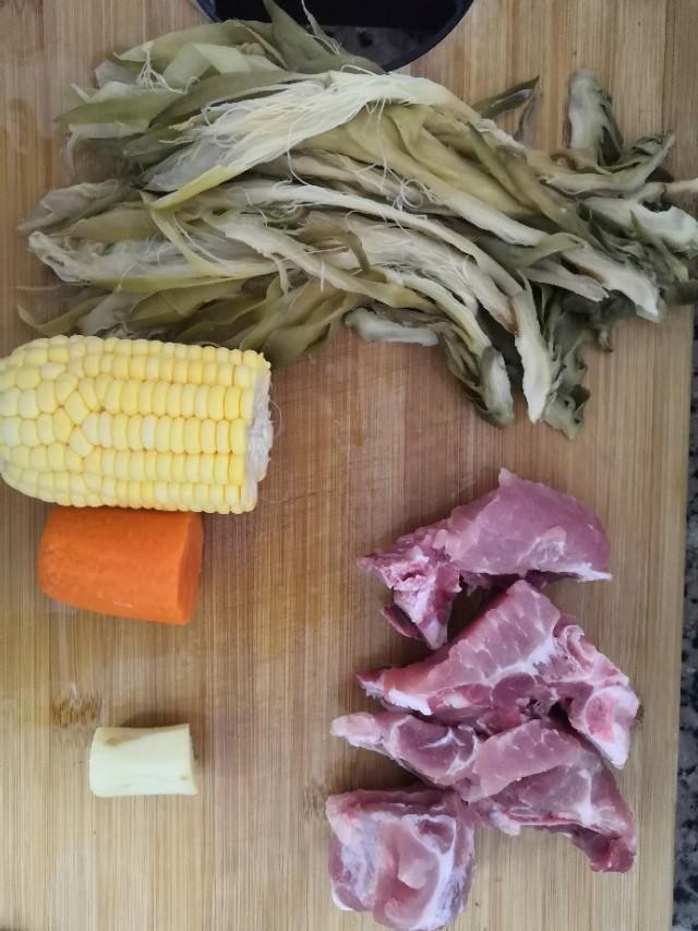 准备食材如下:泡好干霸王花2朵,玉米半根,胡萝卜半根,里脊骨500克,生姜1块,