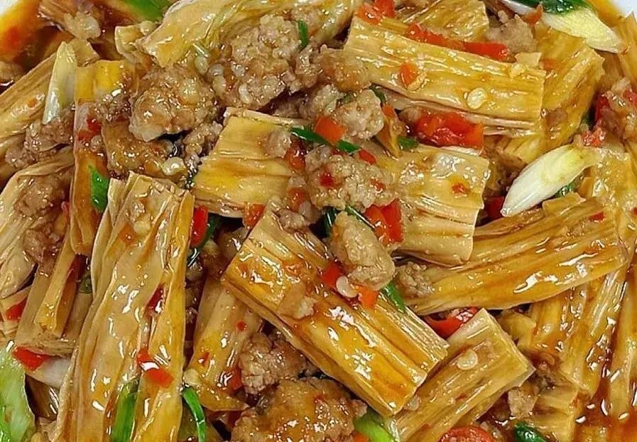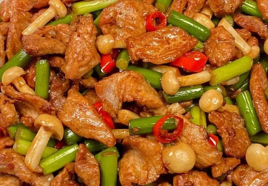 五、菌菇蒜苔炒肉白玉菇、蒜苔焯水后沥干,肉片炒熟后加入调味料和焯好的菌菇蒜苔,炒匀即可。六、腐竹炒肉末炒香蒜末和肉末后,加入腐竹和调味料炒匀,最后淋上水淀粉勾芡,出锅前撒上蒜叶。