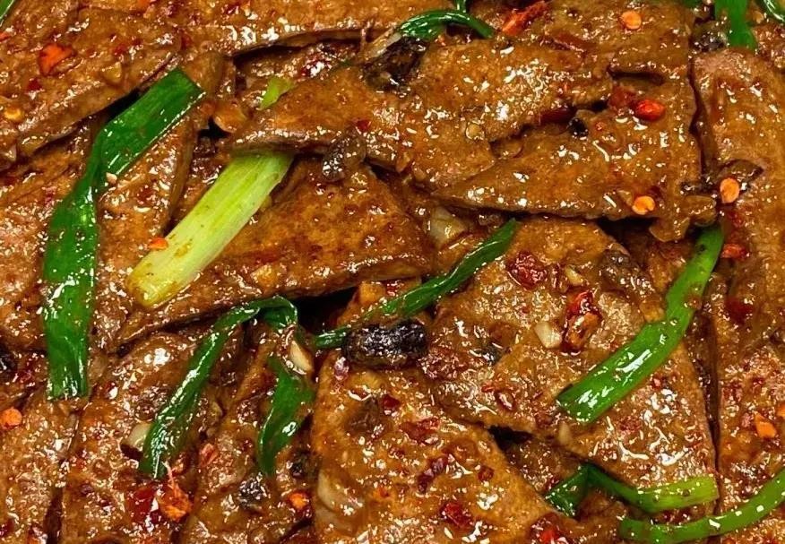三、酱汁油豆腐将油豆腐切块,煎至金黄色后加入蒜末、豆瓣酱、青红椒等炒匀,出锅前撒上葱花。四、香辣爆炒猪肝猪肝片先腌制,炒至变色后加入豆豉、蒜、葱爆炒,最后加入调味料完成。