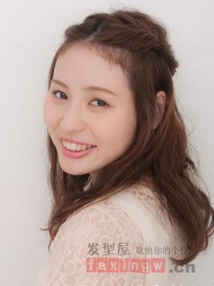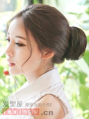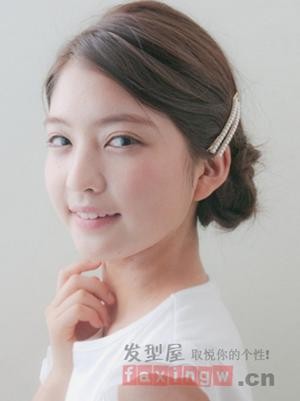 圆脸女生适合扎什么发型呢?栗色系的头发,简单的打造成无刘海的淑女盘发发型,加上发饰的点缀,更显时尚迷人。