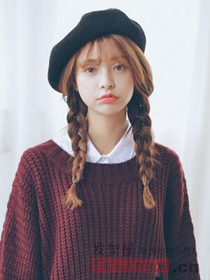 这是一款棕色系的双边编发发型,刘海梳理成空气薄刘海的造型,搭配一款黑色帽子,自然突显十足学院风。