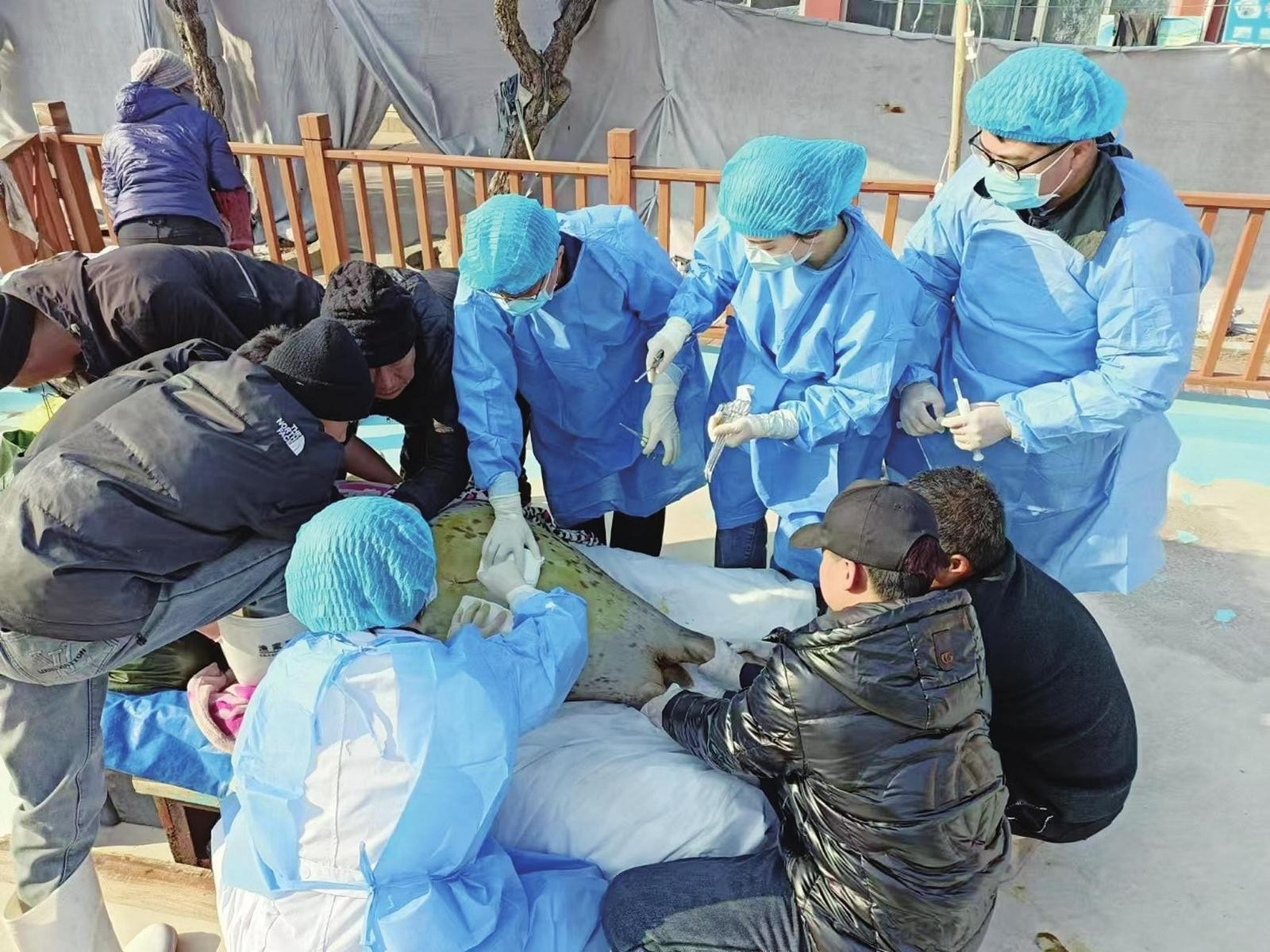 闻讯后,长岛人民医院抽调妇产科、麻醉科、外科专家组成紧急医疗救护队,携带专业设备及药品赶赴现场,确认母海豹因胎位异常无法正常分娩。