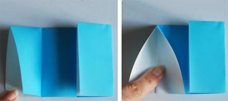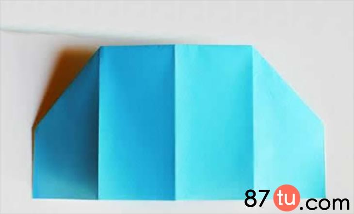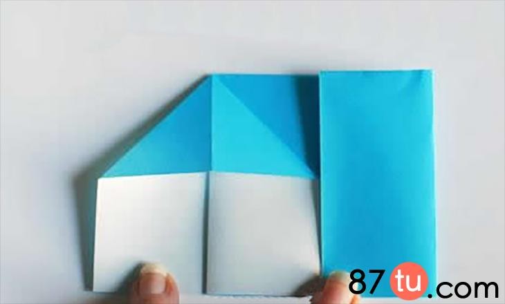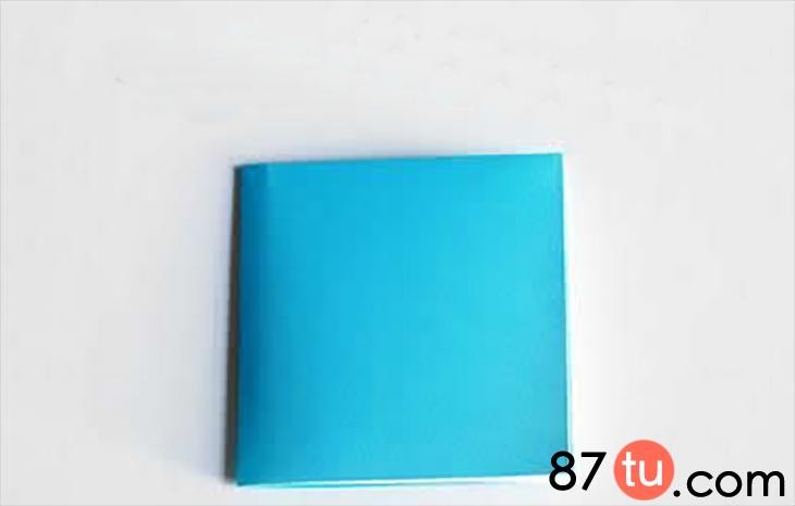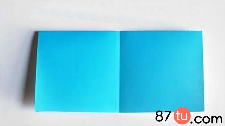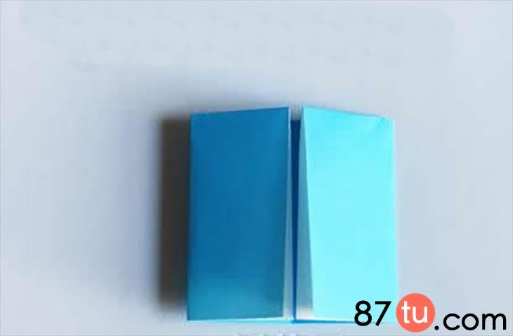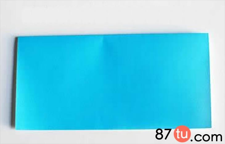 这里先用蓝色的小纸张展示折纸小房子如何制作。将纸张进行上下两个边的对折。