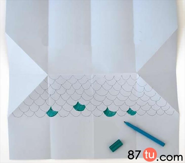当我们使用的是白色的纸张的时候,我们可以对其进行一个装饰,这里手绘出瓦片来,然后用彩笔上色。
