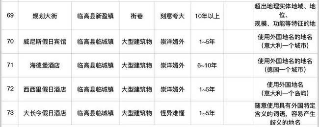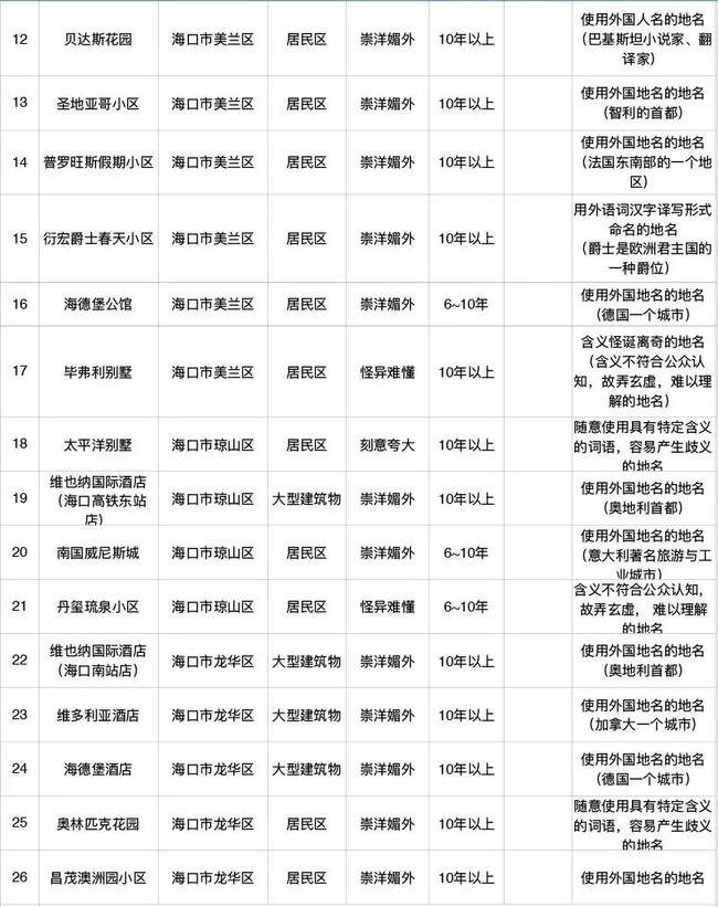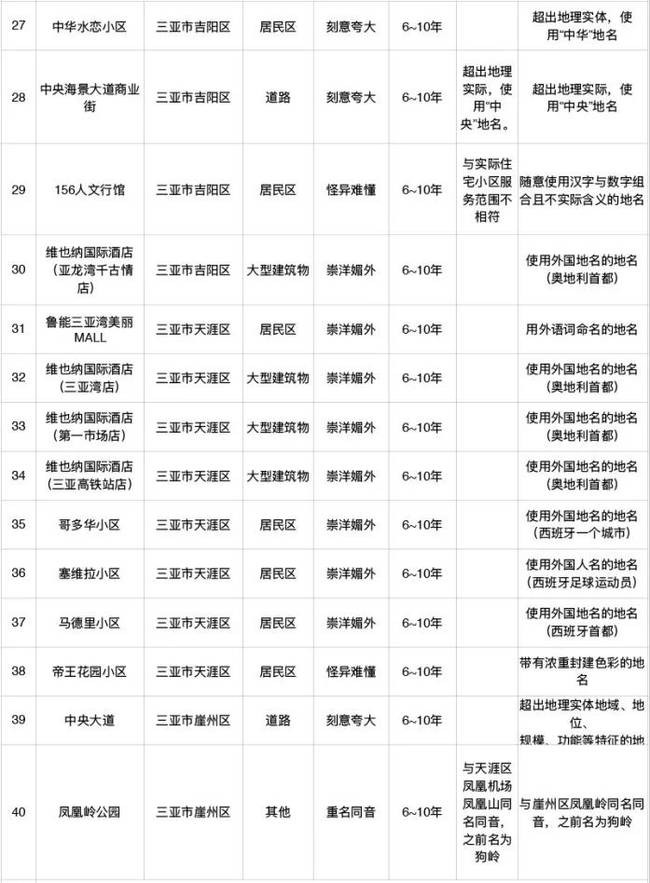 近日,海南省民政厅发布关于需清理整治不规范地名清单的公示,三亚共有14个地名被列入海南省需清理整治不规范地名清单。其中,中华水恋小区、中央海景大道商业街、中央大道因刻意夸大被列入清单;维也纳国际酒店(亚龙湾千古情店)、鲁能三亚湾美丽MALL、维也纳国际酒店(三亚湾店)、维也纳国际酒店(第一市场店)、维也纳国际酒店(三亚高铁站店)、哥多华小区、塞维拉小区、马德里小区因崇洋媚外被列入清单;156人文行馆、帝王花园小区因怪异难懂被列入清单;凤凰岭公园因重名同音被列入清单。