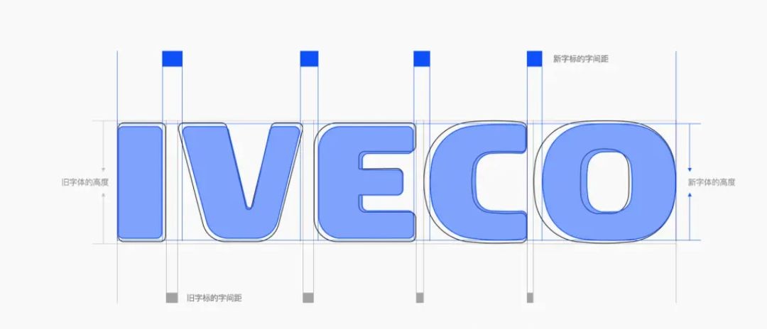 新版本的字标中「IVECO」字标的字间距和字体大小也有明显变化。五个字母的字间距比以前增加了近一倍的距离。如果将新旧两个版本放在同一个固定空间内比较,可以看出由于字间距的调整,字体的高度相对较矮。