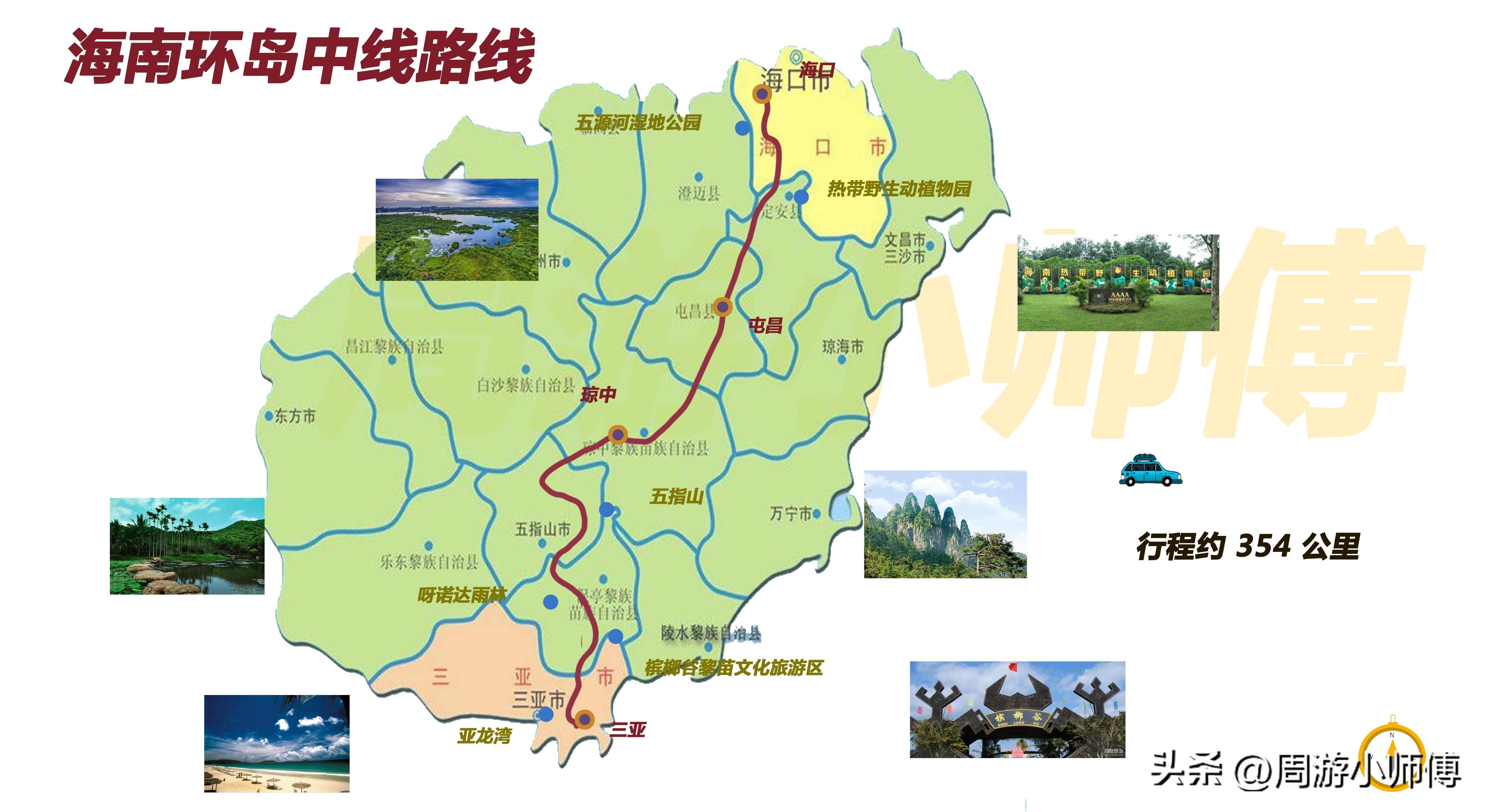 环岛中线路线以热带雨林、山川峡谷、少数民族风情等为主题特色的自驾路线。行程约350公里。