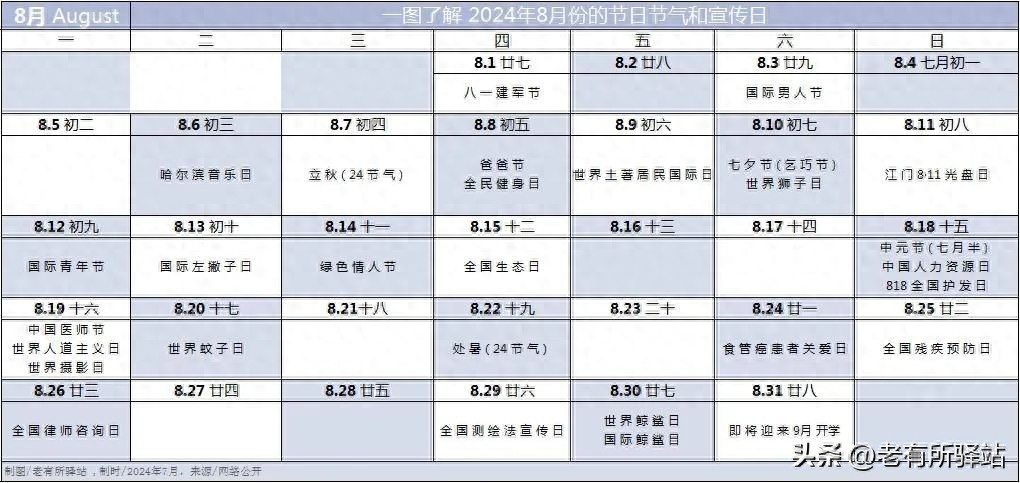 一图了解2024年8月份的节日节气和宣传日