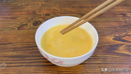 1.鸡蛋打入碗中放入2克料酒去腥,料酒不仅能去腥还能使鸡蛋炒出来更蓬松软嫩,将鸡蛋打成鸡蛋液备用。