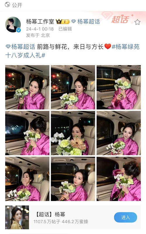 在4月1日的零点,杨幂选择了一个寓意丰富的时刻,发布了这条微博。她巧妙地融入了18岁的00:18,象征着青春与活力,以此向粉丝们传递出深深的祝福与感激。这条微博中,杨幂的字里行间都流露出对粉丝们的真挚感谢与爱意,她用简洁而有力的文字,为蜜蜂们送上了生日的祝福。