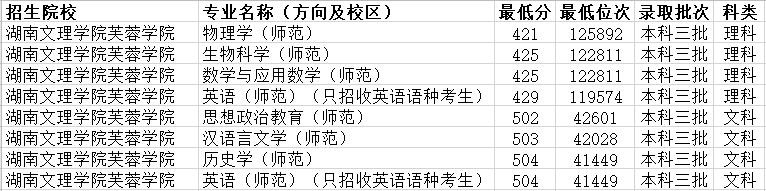 湖南文理学院芙蓉学院设置的师范方向的专业有7个,其中汉语言文学、历史学、思想政治教育三个专业仅面向文科生招生,生物科学、数学与应用数学、物理学仅面向理科生招生,2019年具体招生录取情况如下: