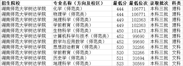 湖南师范大学树达学院所设置的师范方向专业数量是最多的,在2019年招生中有9个专业,其中面向文科生招生的专业有4个,2019年具体招生录取情况如下: